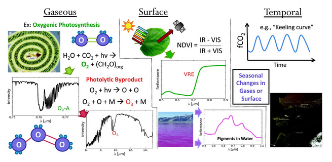 Fig. 1 Summary of gaseous, surface, and temporal biosignatures. Left panel: gaseous biosignatures are direct or indirect products of biological processes. One example is molecular O2 generated as a by-product of photosynthesis that is then photochemically processed into O3 in the stratosphere. Middle panel: surface biosignatures are the spectral signatures imparted by reflected light that interacts directly with living material. One example is the well-known VRE produced by plants and the associated NDVI used for mapping surface vegetation on Earth . Right panel: time-dependent changes in observable quantities, including gas concentrations or surface albedo features, may represent a temporal biosignature if they can be linked to the response of a biosphere to a seasonal or diurnal change. An example is the seasonal oscillation of CO2 as a response to the seasonal growth and decay of vegetation.[6]