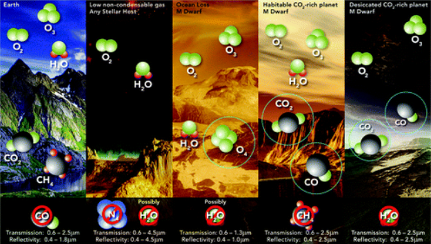FIG. 2. Potential false positive mechanisms for O2. This cartoon summarizes the atmospheric mechanisms by which O2 could form abiotically at high abundance in a planetary atmosphere [6]. The extreme left panel is Earth, the four panels to the right show the different mechanisms and their observational discriminants. Circled molecules, if detected, would help reveal a false positive mechanism, a lack of detection of the “forbidden” molecules in the bottom shaded bar would also help to reveal the false positive mechanism. For example, the presence of CO and CO2, and the absence of CH4, is a strong indicator for a photochemical source of O2 from the photolysis of CO2 on a habitable CO2-rich M dwarf planet (Figure credit: Ron Hasler)