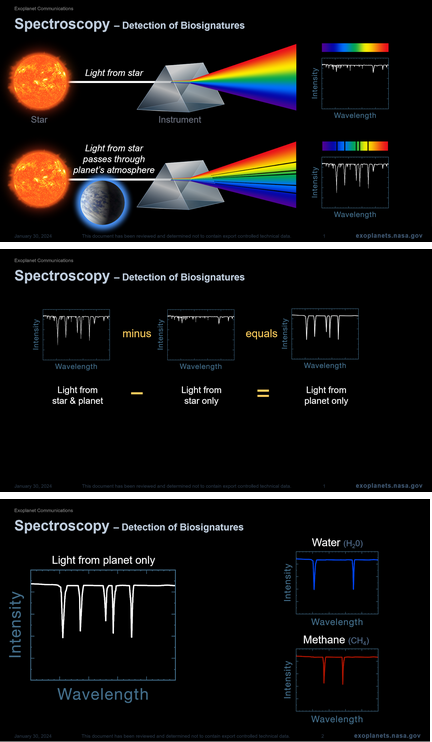 Below is a simple visual representation by NASA that explains the basic idea of spectroscopy and how it is used to detect biosignatures on distant exoplanets.