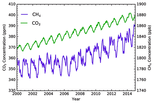 FIG. 4. Gas abundance oscillations as a possible temporal biosignature. Volume mixing ratio measurements of CH4 and CO2 from the National Oceanic and Atmospheric Association (NOAA) at Mauna Loa, HI from 2000 to 2015. The seasonal variations in both gases are partially reflective of the seasonal change in the productivity of the biosphere in the northern hemisphere (the secular increase in both gases is attributable to industrial emissions). These data were obtained from the NOAA's Earth System Research Laboratory (
