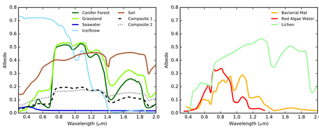 Fig. 3. The “Red-Edge” biosignature near 0.7 µm. (Left) Albedo spectra of red-edge-producing vegetation (forest, grassland) and other common surface types (seawater, ice, and soil). The composite 1 albedo consists of 66% seawater, 14% grassland and brush, 4% conifer forest, 5% bare soil, and 11% snow and ice, consistent with the equatorial view of Earth during spring equinox. The spectrum labeled composite 2 is the same as composite 1 except with the weighting for vegetation replaced by bare soil. (Right) Albedo spectra of other red-edge-producing oxygenic photosynthesizers.