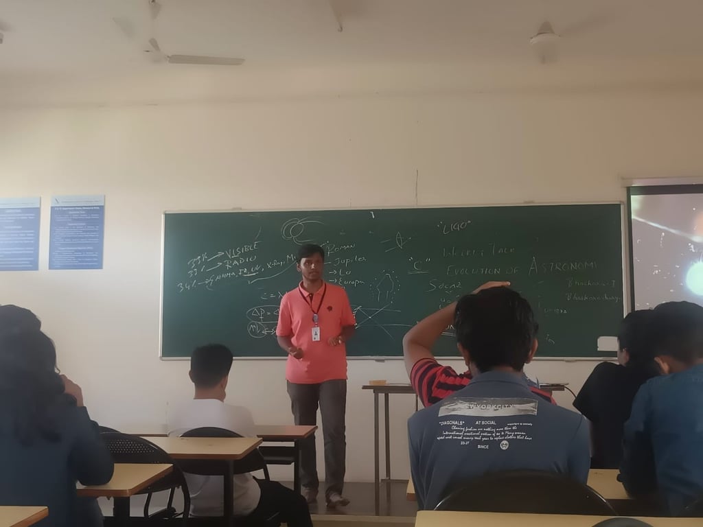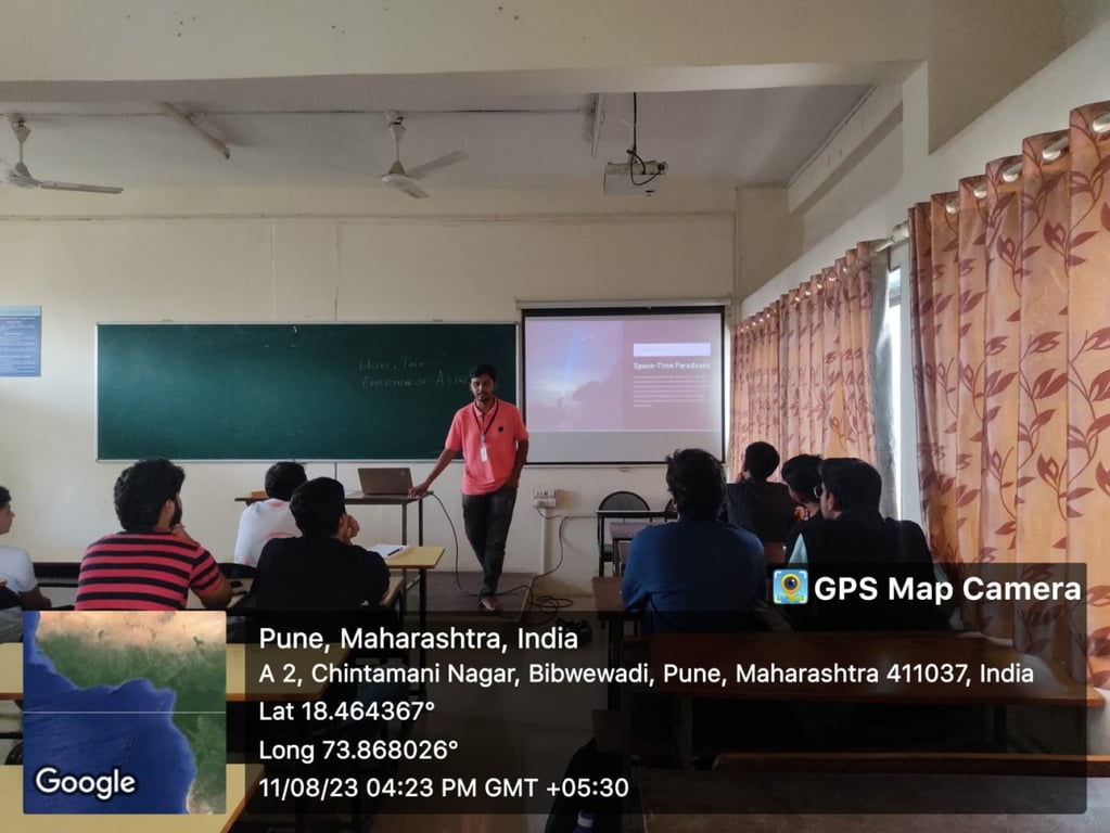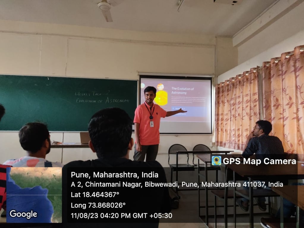 Within the confines of Lecture Hall 1410 at the Vishwakarma Institute Of Technology, a remarkable voyage into the depths of the cosmos unfolded on the 11th of August. The Antariksh - Astronomy Club , driven by an insatiable curiosity and a shared passion for the mysteries of the universe, proudly presented its second internal talk. This captivating discourse, entitled "Evolution of Astronomy," was expertly navigated by Sahil Sawant, an ardent club member. The talk was attended by 15 enthusiastic volunteers. As attendees gathered in anticipation, the room transformed into a sanctuary of exploration, where the very fabric of space and time would be unfurled.