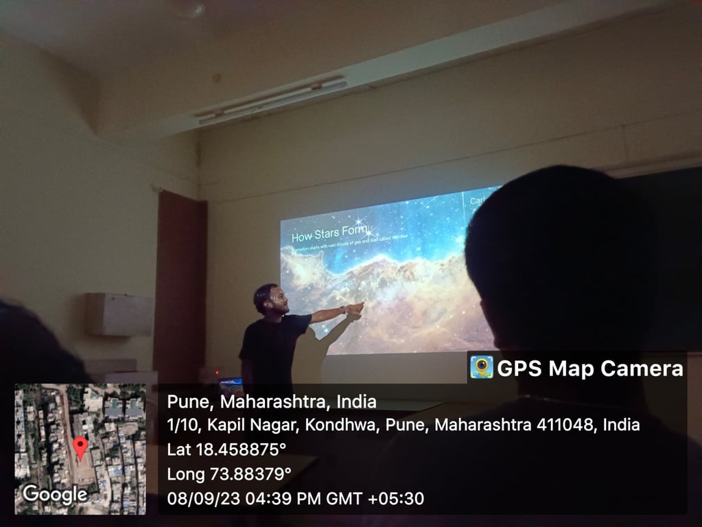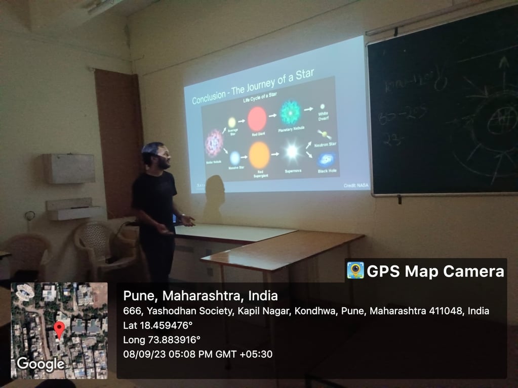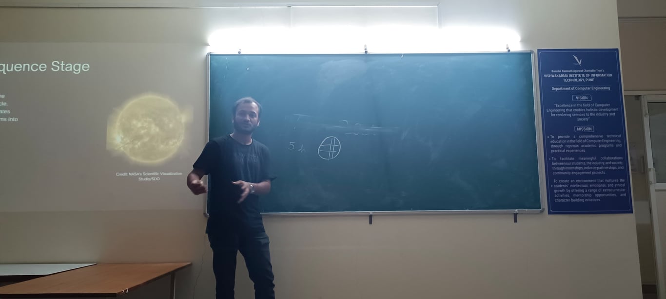 On the enchanting evening of September 8, 2023, stargazers and cosmic enthusiasts gathered in Lecture Room B304 at the Vishwakarma Institute of Information Technology Vishwakarma Institute of Information Technology (VIIT) to embark on a captivating journey through the cosmos. The occasion was the much-anticipated internal talk hosted by the Antariksh - Astronomy Club , titled "Life Cycle of Stars." With a diverse audience ranging from seasoned club members to intrigued newcomers, the stage was set for a cosmic odyssey.