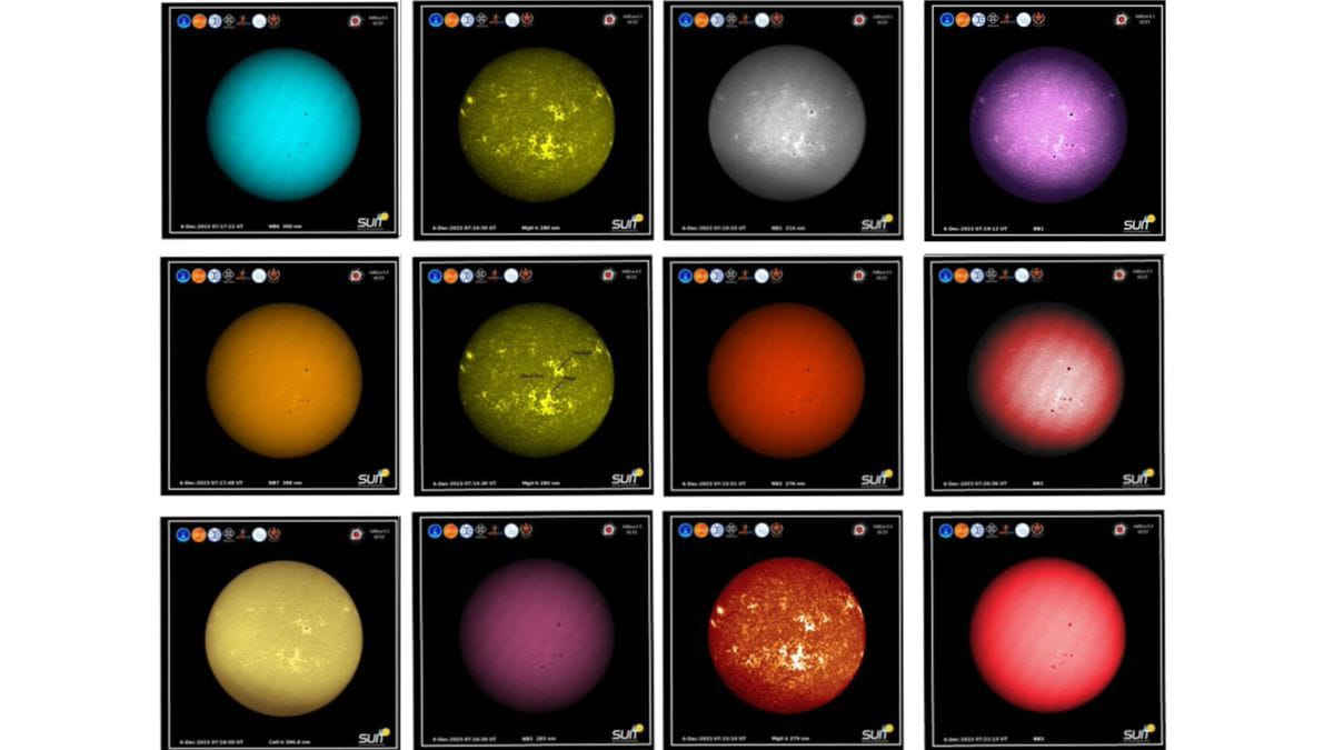 The Solar Ultraviolet Imaging Telescope (SUIT) instrument on board the Aditya-L1 spacecraft has successfully captured the first full-disk images of the Sun in the 200-400 nm wavelength range. SUIT captures images of the sun's photosphere and chromosphere in this wavelength range using various scientific filters.