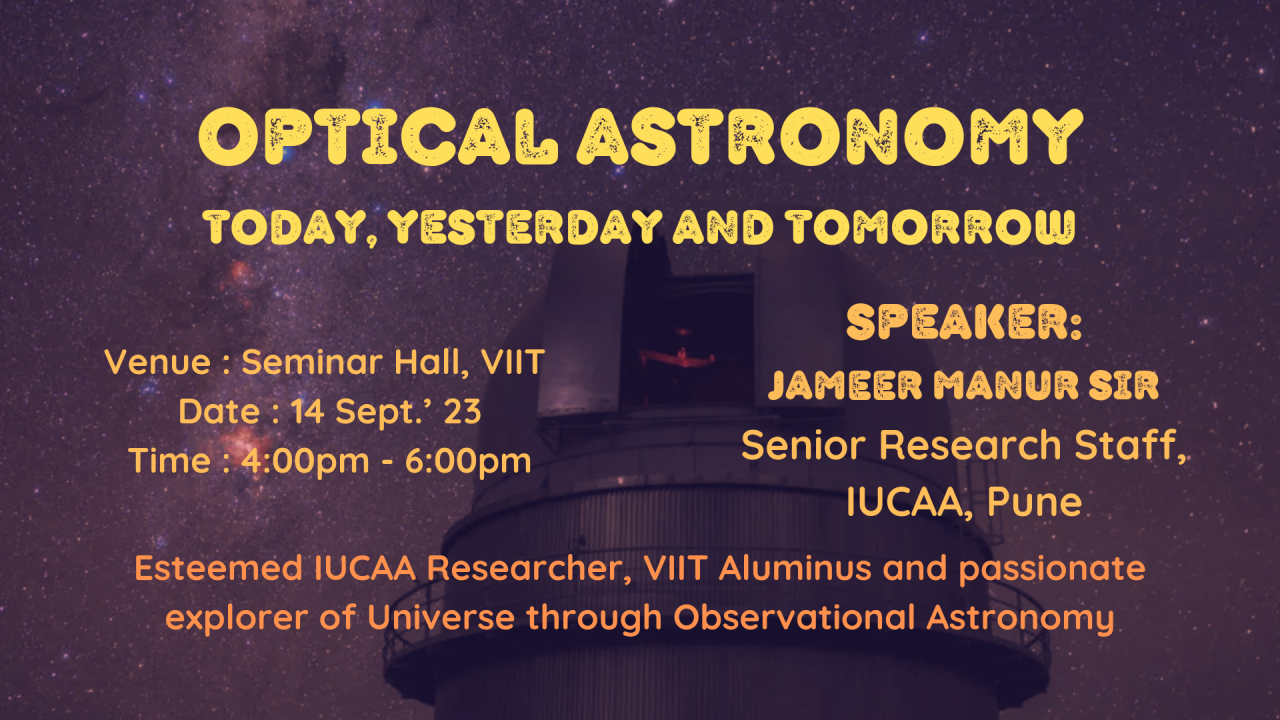 On the 14th of September 2023, the Seminar Hall at Vishwakarma Institute of Information Technology (VIIT), Pune, was abuzz with excitement and curiosity as Jameer Manur Sir, the illustrious founder of Antariksh Club and a Senior Research Staff member at IUCAA (Inter University Centre for Astronomy and Astrophysics), took the stage to deliver an engaging and insightful talk on "Observational Astronomy - yesterday, today, and tomorrow."