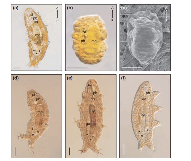 Figure 1. Cryptobiotic and non-cryptobiotic survival in extreme environments. (a–c) (a) Active state; (b) light microscopy and (c) scanning electron microscopy of the cryptobiotic tun state induced by desiccation. In this state R. coronifer e.g. tolerates complete desiccation as experienced by vacuum condition and freezing in liquid nitrogen. (d–f): Microscopy of Halobiotus crispae from the Danish population at Vellerup Vig, Denmark. This tardigrade is one of a few species of eutardigrades that have secondarily invaded the marine environment. Halobiotus crispae in the active stage (d) uniquely adapted to cope with profound changes in ambient salinity occurring in tidal and subtidal habitats. Upon transfers to dilute salt water solutions, active stage H. crispae swell (e) and subsequently regulate their body volume to near control conditions. Halobiotus crispae is characterized by appearing in different cyclomorphic stages. The pseudosimplex 1 stage (f) is freeze tolerant. eo, esophagus; mg, midgut; pb, pharyngeal bulb; st, stylet 2011 The Authors Acta Physiologica 2011 Scandinavian Physiological Society.
