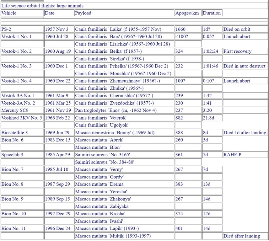 LIST OF ANIMALS INVOLVED IN SPACE MISSIONS: