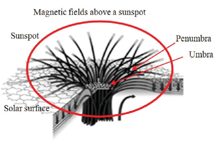 The above figure gives an idea about the structure of the sunspot. The sunspot consists of the umbra (the darker region) and the penumbra (the semi-darker region). The magnetic field lines ejected from the umbra of the sun are vertical to the surface of the sun while in penumbra the field lines become horizontal which are accompanied by the radial flow of gas. This is known as Evershed flow which was discovered in the Kodaikanal Solar Observatory in India.