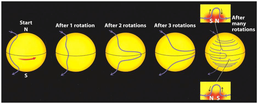 The sun’s magnetic field is complex and it involves depth of physics to be covered. Rather than going into details the main objective to understand the sunspots must be addressed. Differential rotation plays a key role in the creation of a solar magnetic field along with the convection zone. The Sun revolves every 25 days at the equator and takes slower to rotate at higher latitudes—up to 35 days at the poles—than Earth, which rotates every 24 hours at all latitudes. This type of rotation is termed differential. Different layers of the sun have different speeds. The rubber band analogy can be helpful to understand this.